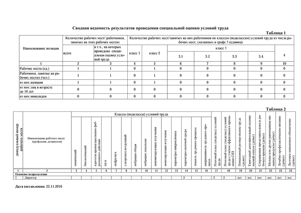Сводная ведомость результатов проведения специальной оценки условий труда Ассоциации «СРО «МПО»